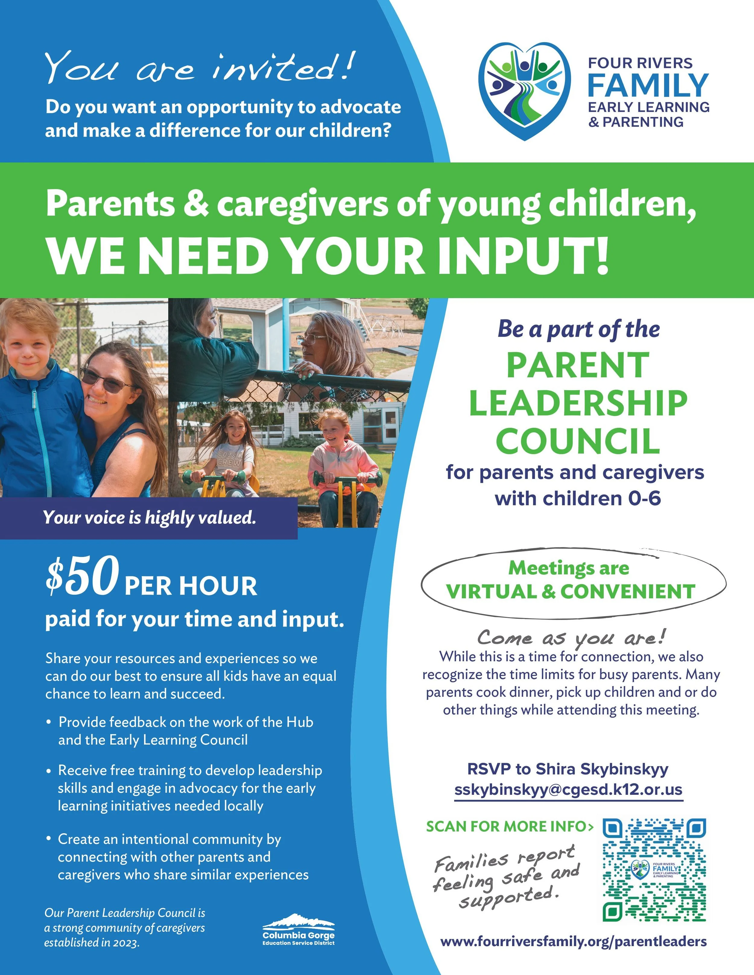 The Parent Leadership Council consists of up to nine parents of children age 0-8 who have three primary goals: